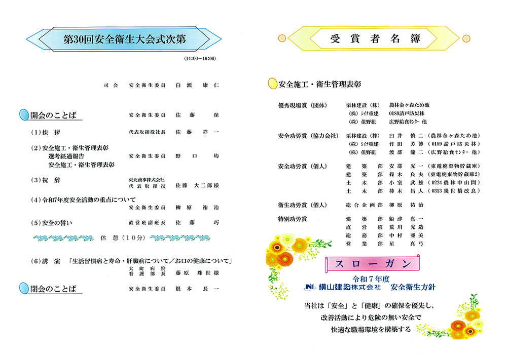 令和7年9月17日(水)浪江町地域スポーツセンターにて、横山建設(株)の第30回「安全衛生大会」が、社員及び協力会社等の関係者ら約200名が参加のもと盛大に開催されました。