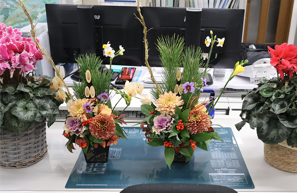 生け花制作 2026.01.06 福利厚生活動 毎年恒例となった、女性事務員による生け花制作が12月26日(金)に行われました。 松、竹、ナンテン等を使った、お正月にぴったりの、華やかで豪華な生け花が制作されました。