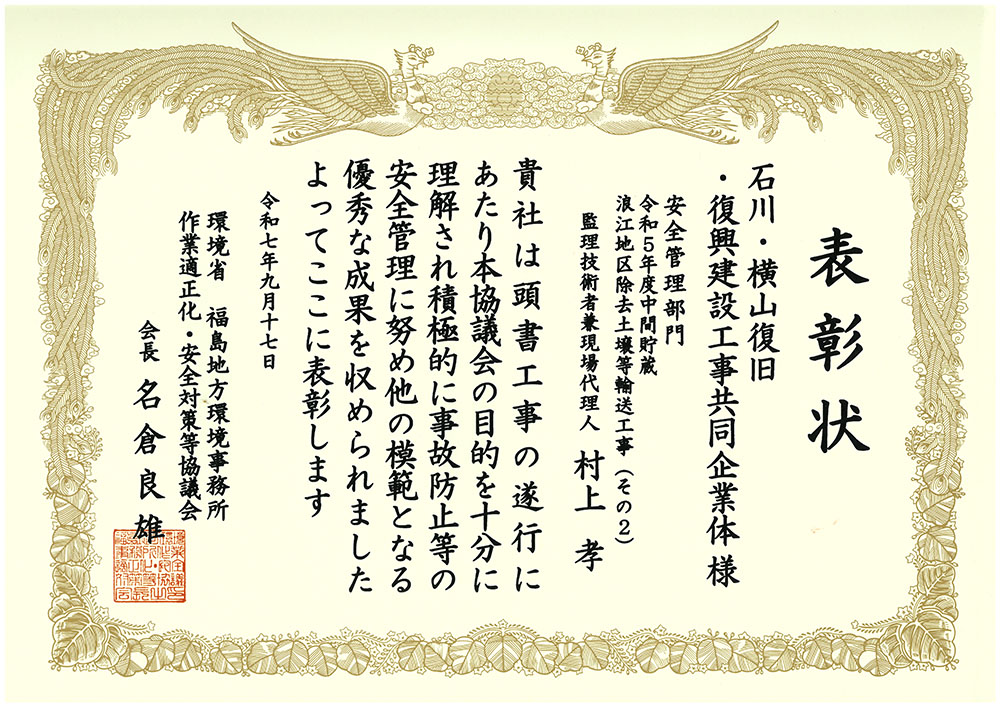 環境省 福島地方環境事務所 作業適正化・安全対策等協議会 会長表彰